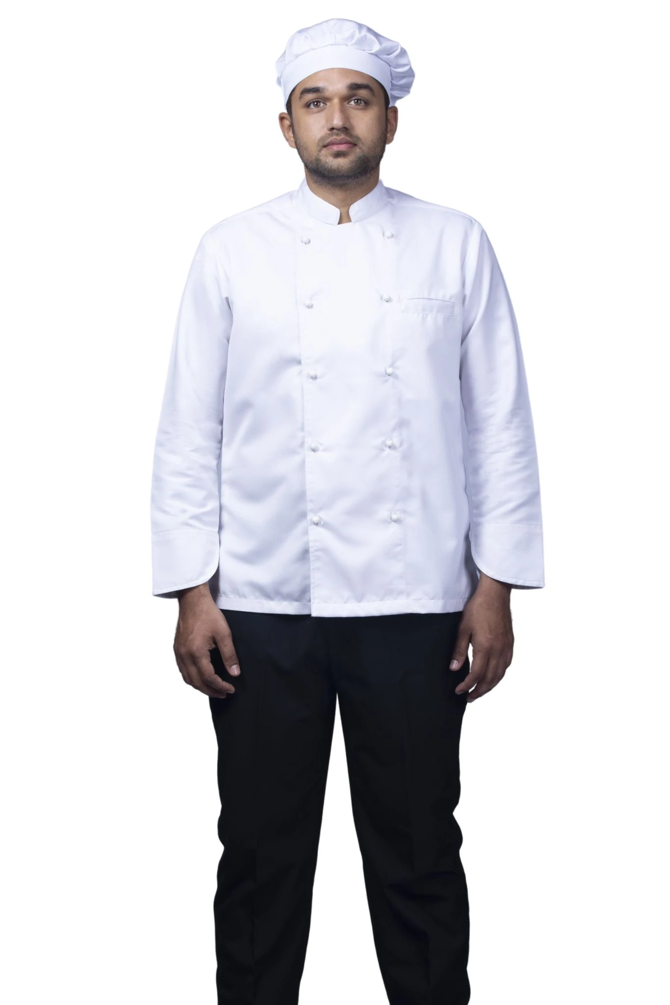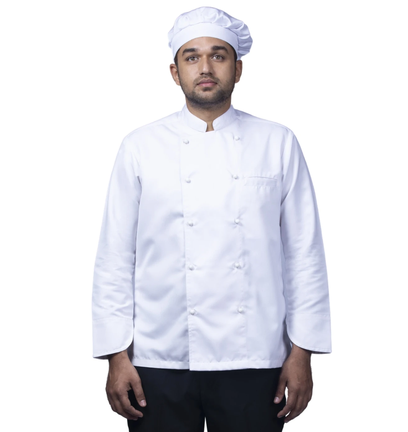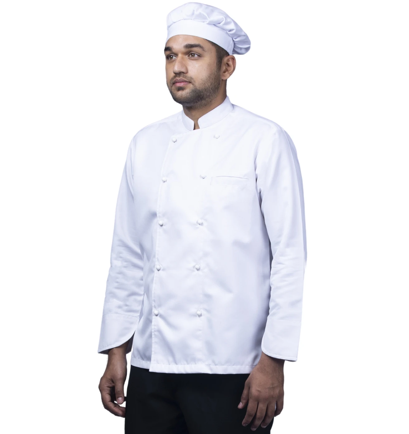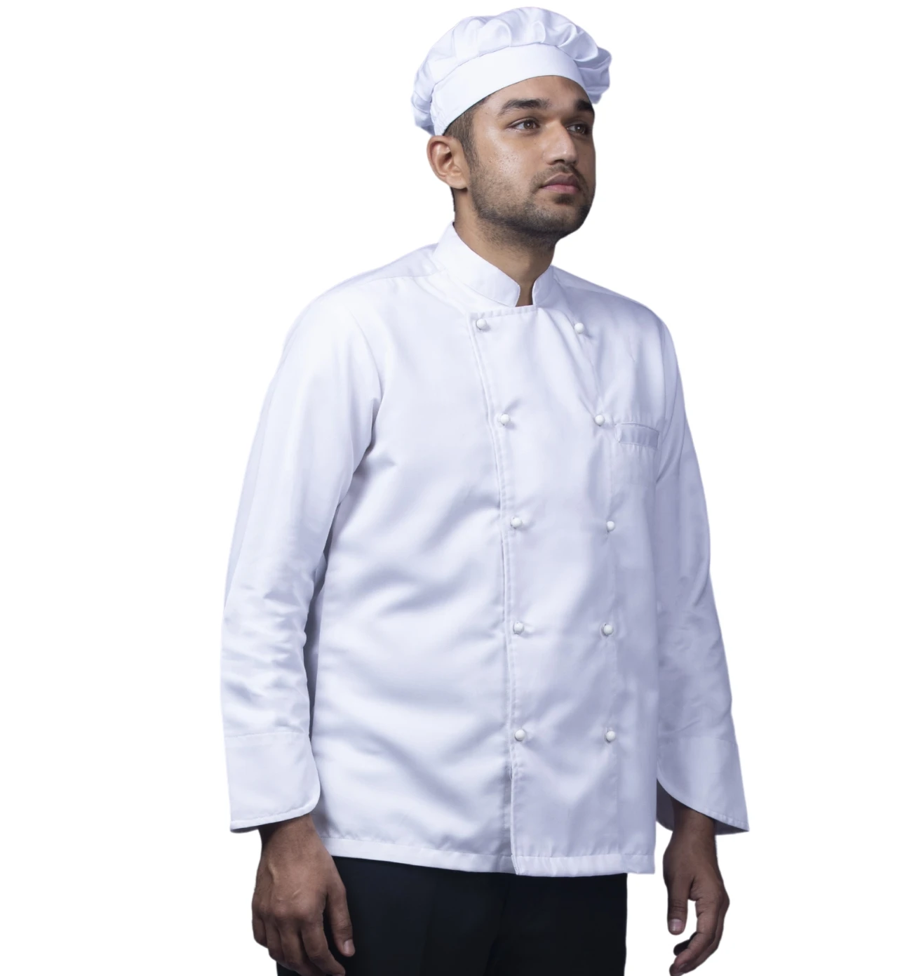 A classic white chef coat, designed for comfort, durability, and a professional appearance in the kitchen.