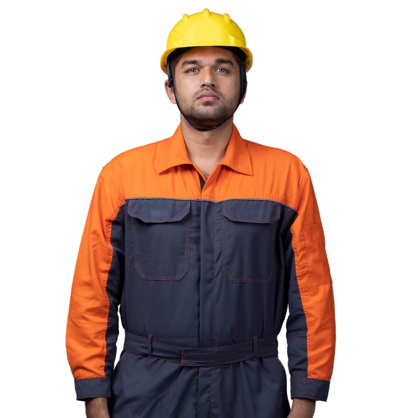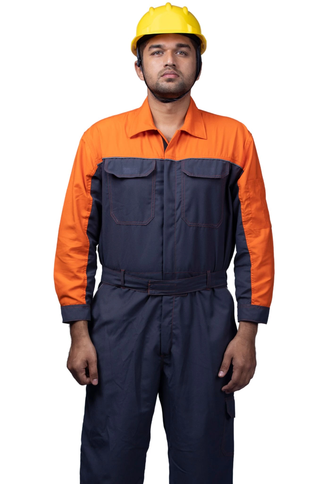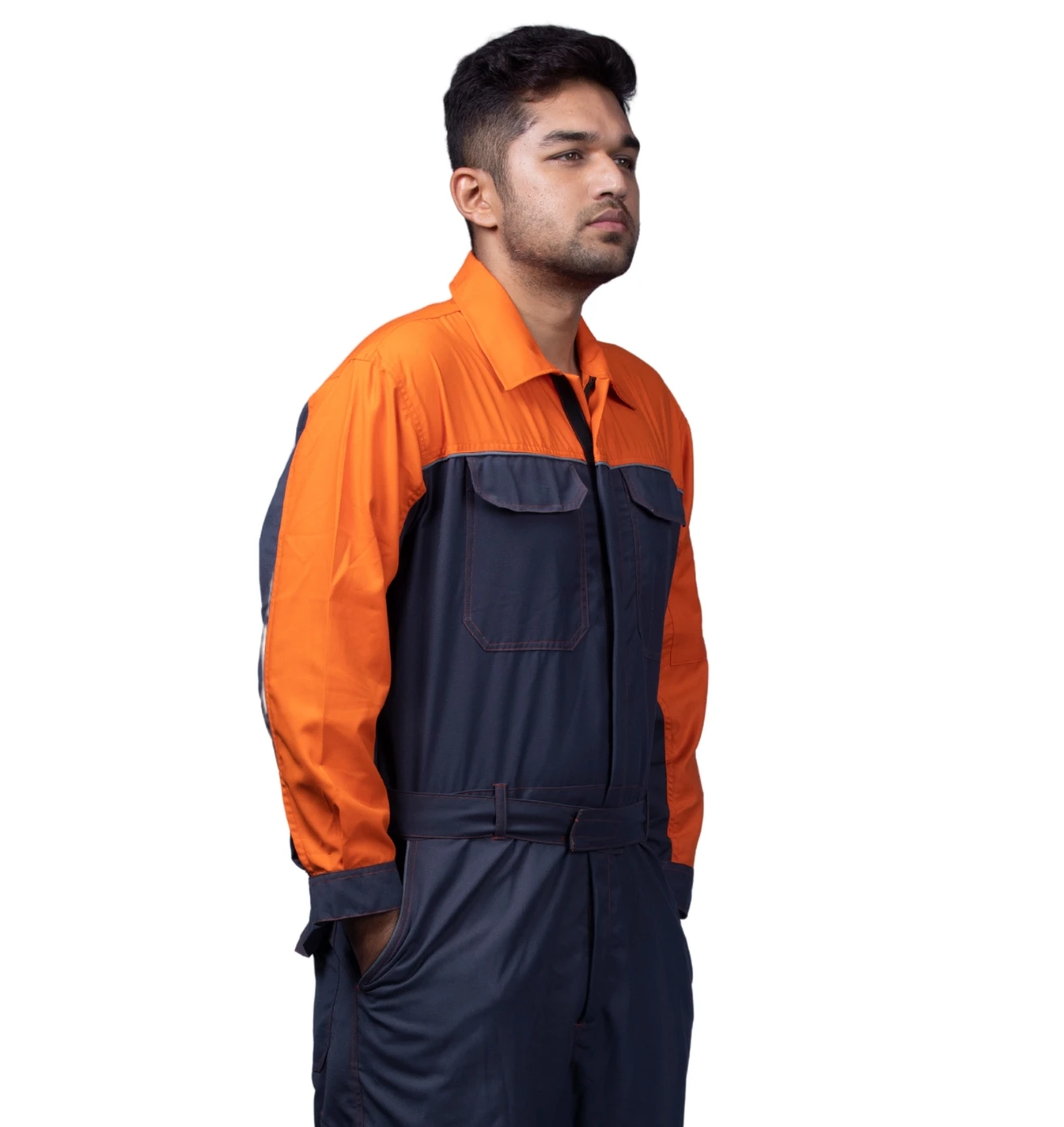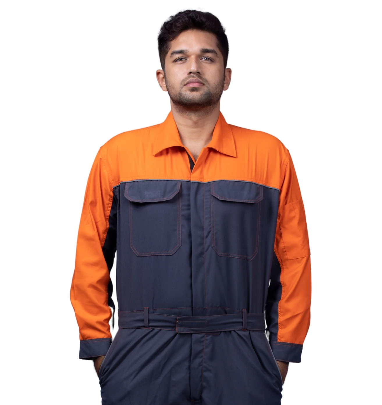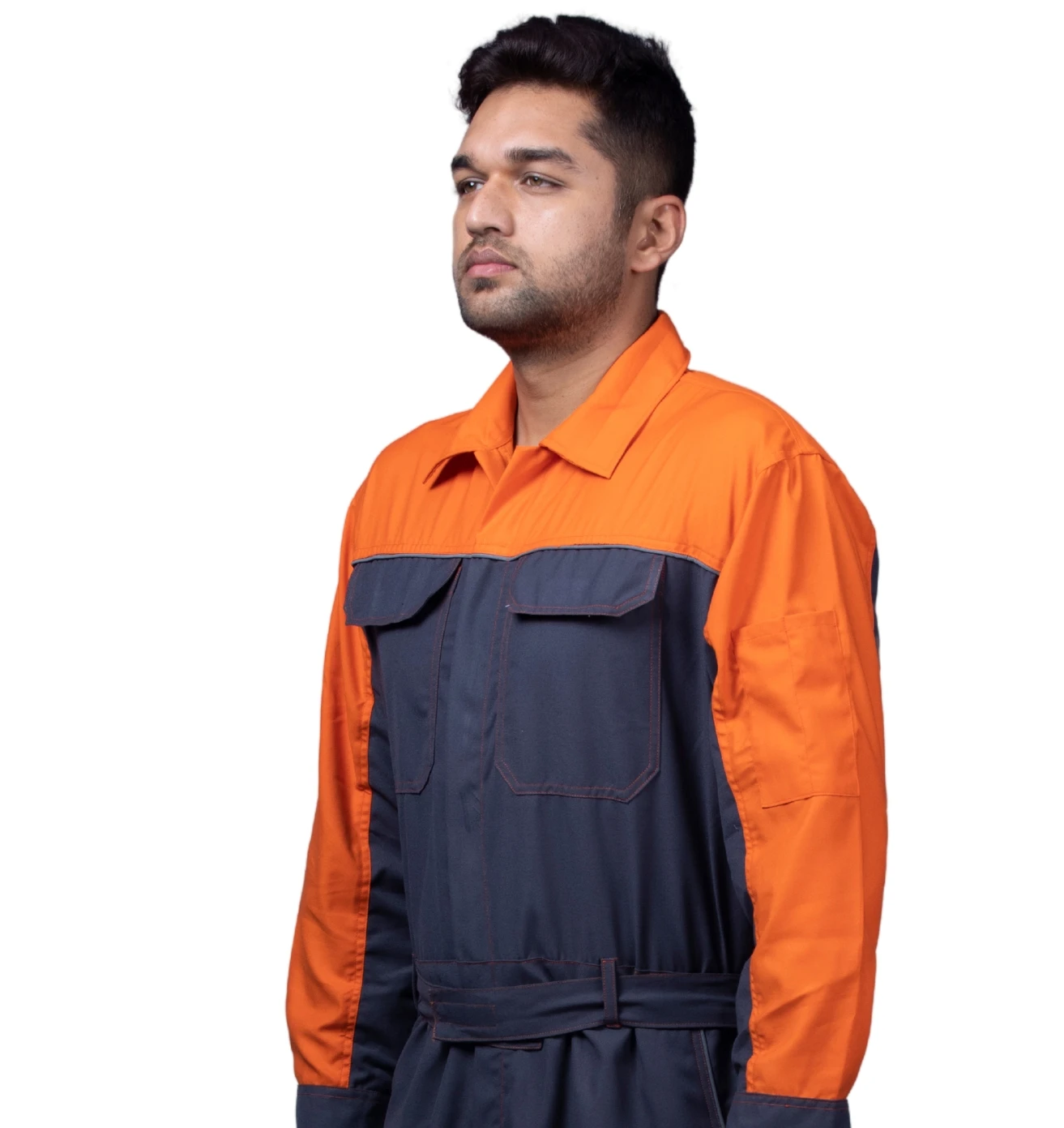 High-visibility dark grey and neon orange boiler suit, ensuring safety, comfort, and durability for industrial professionals.