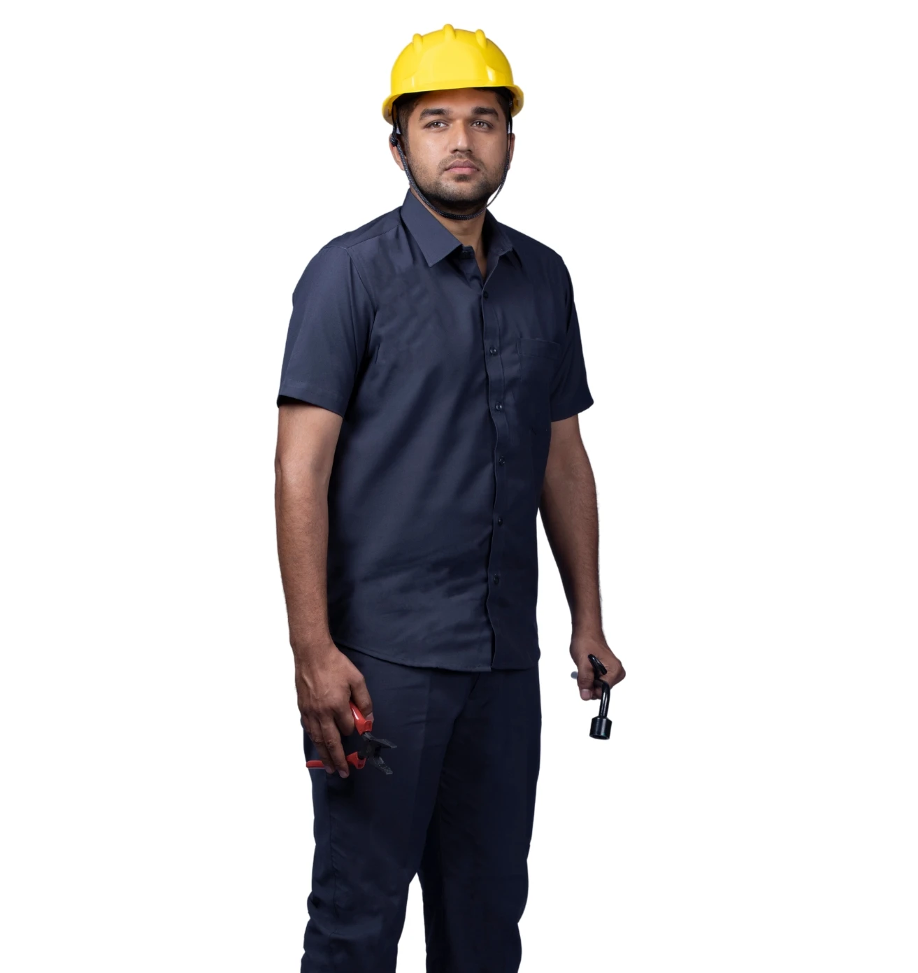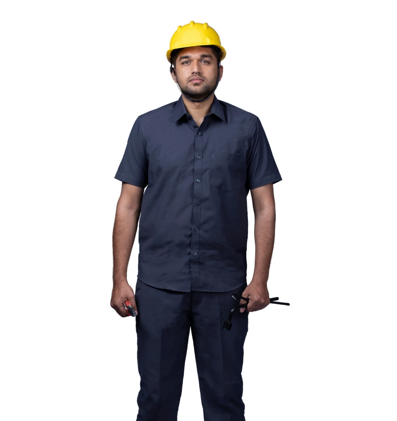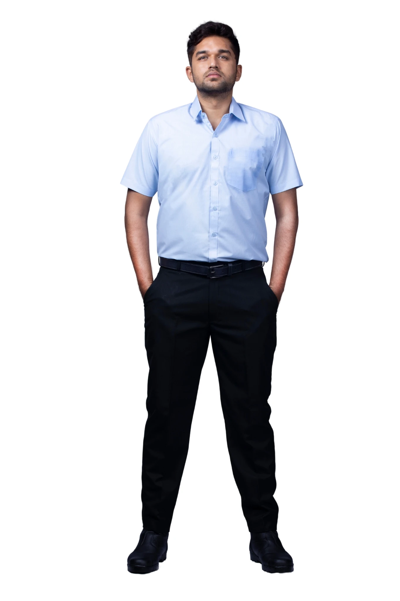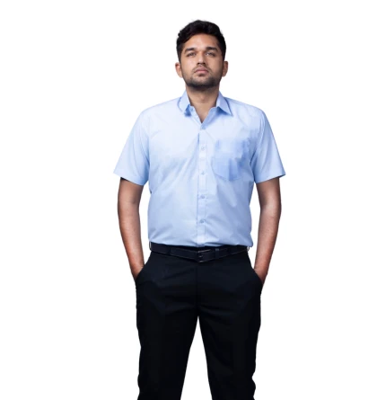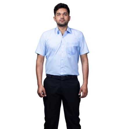 A professional workwear combo featuring a sky-blue half-sleeve shirt and durable navy-blue matty trousers for all-day comfort.