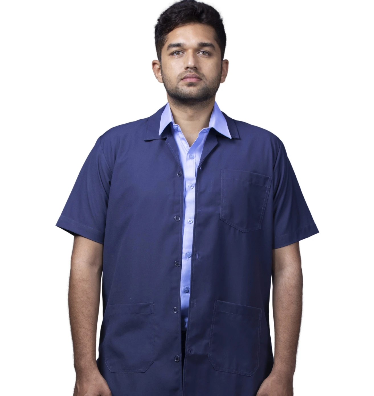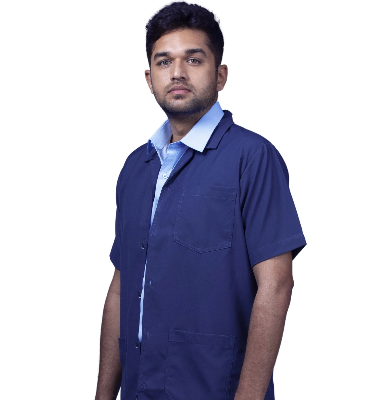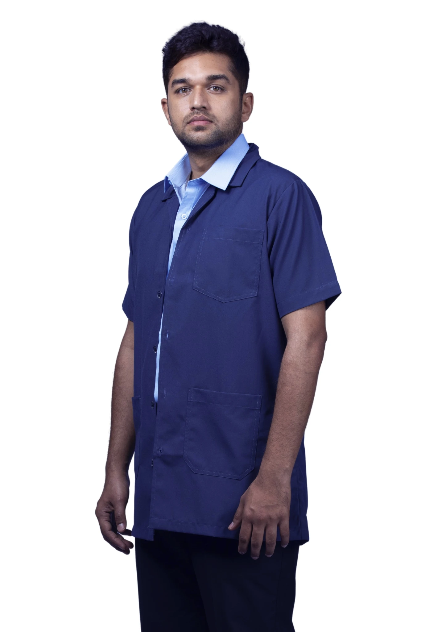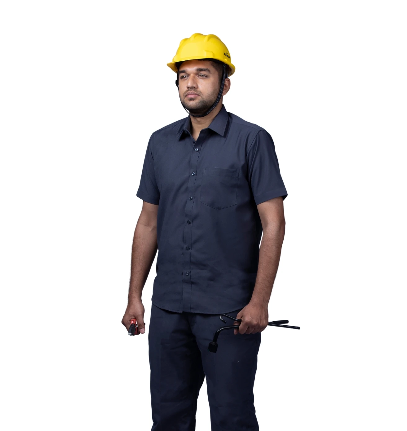 A professional workwear combo featuring a sky-blue half-sleeve shirt and durable navy-blue matty trousers for all-day comfort.
