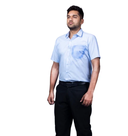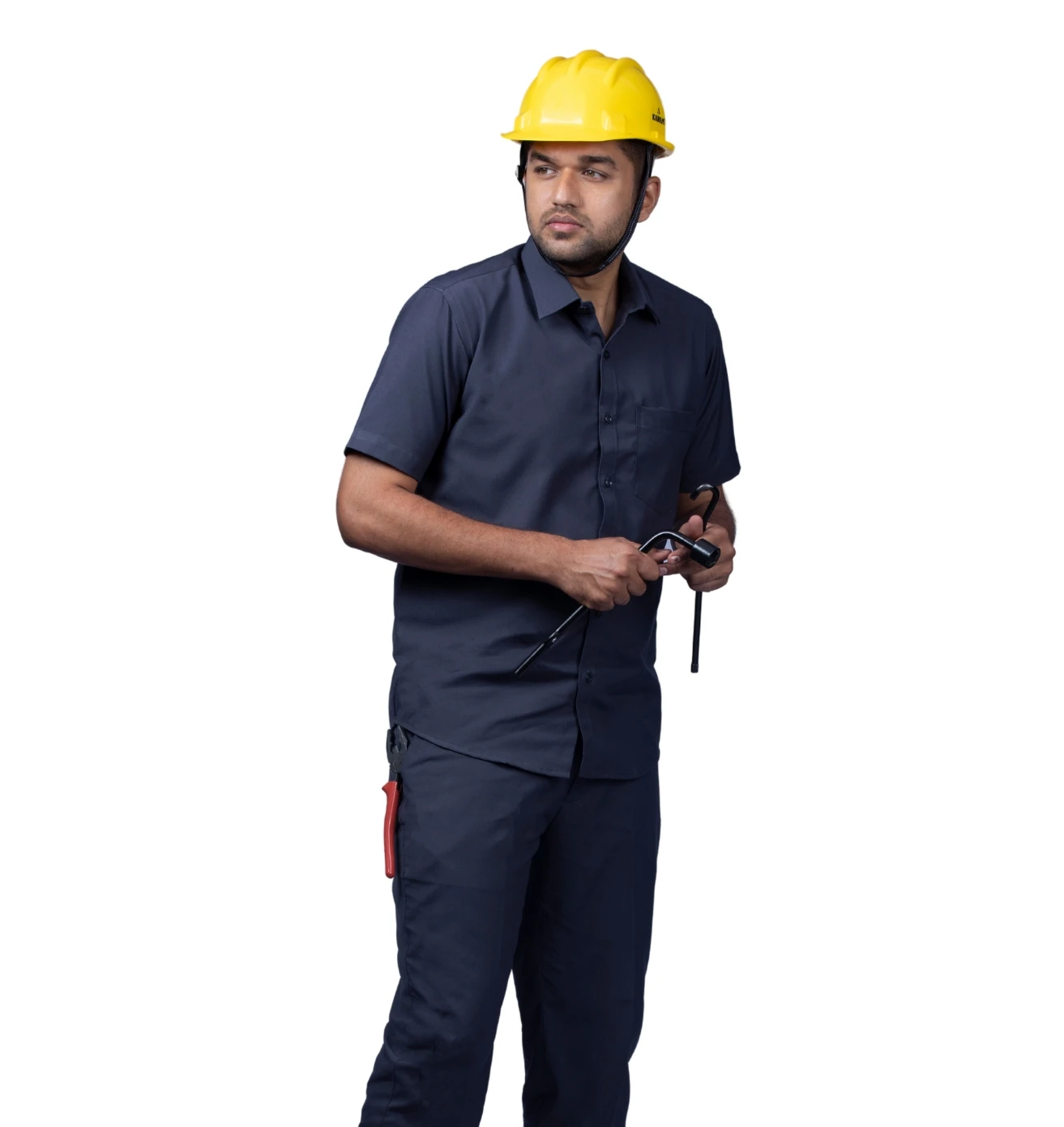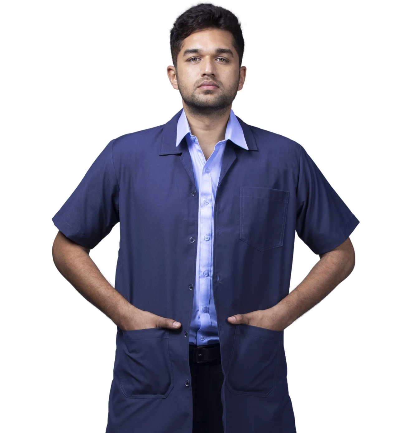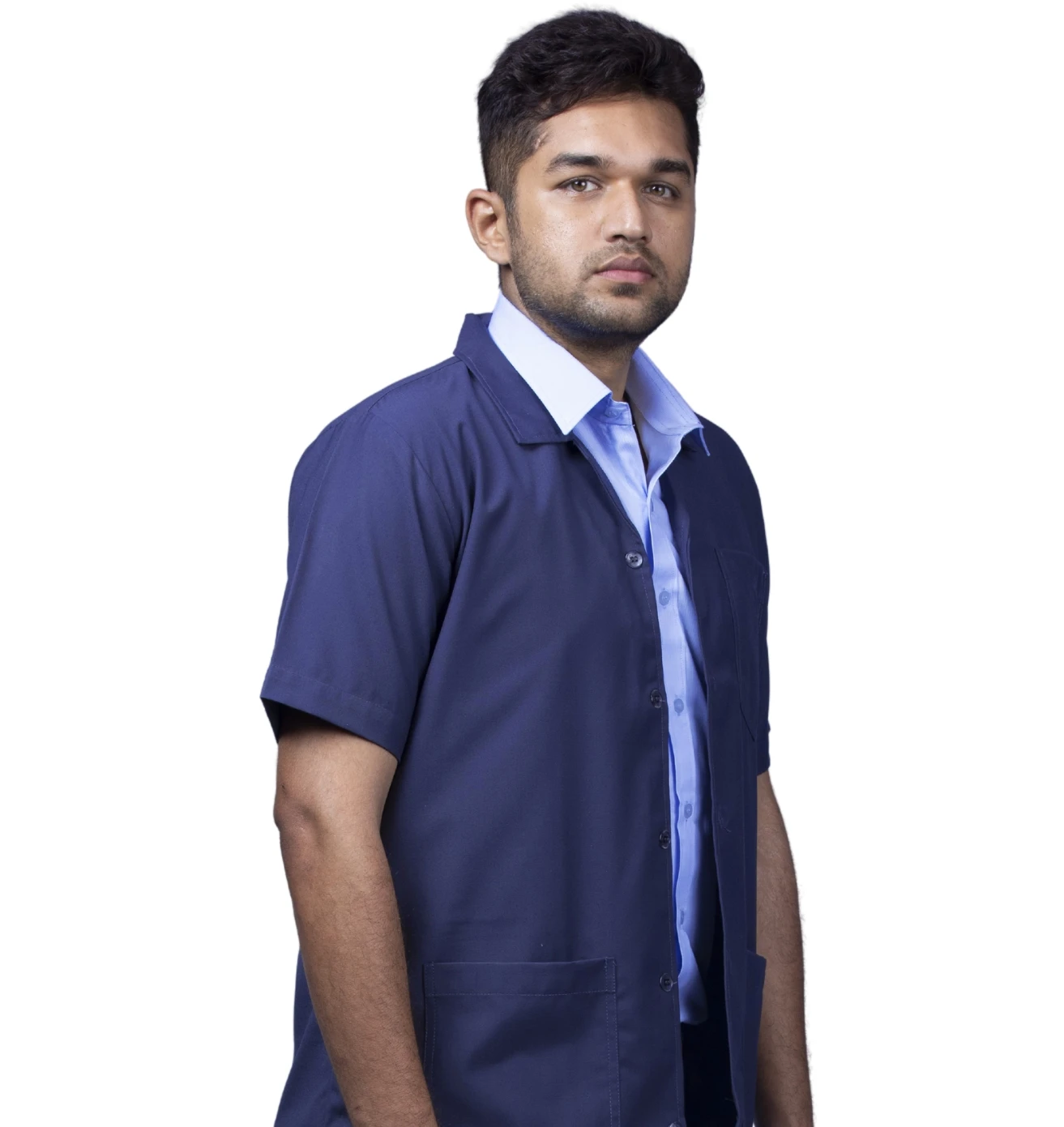 A professional workwear combo featuring a sky-blue half-sleeve shirt and durable navy-blue matty trousers for all-day comfort.