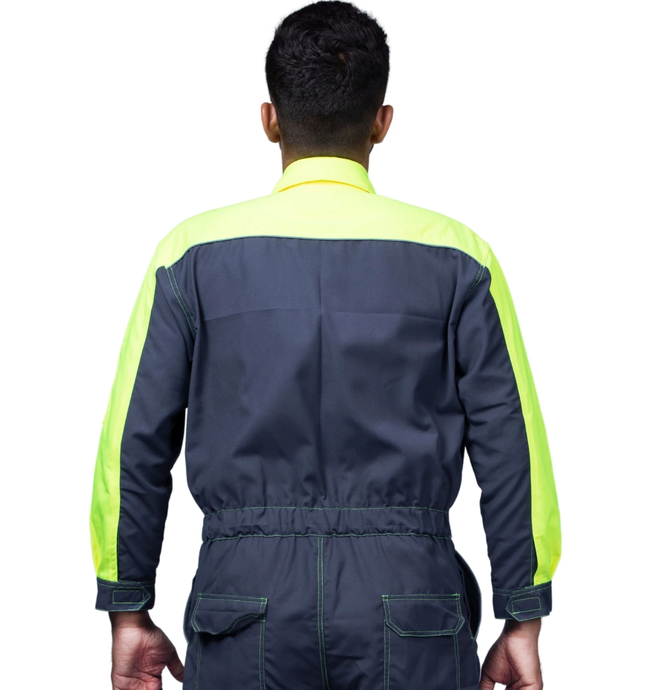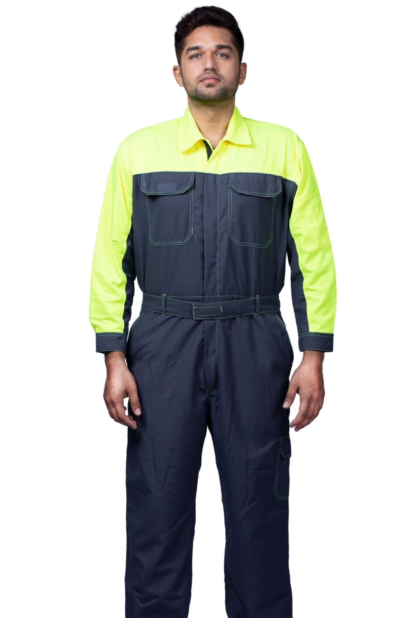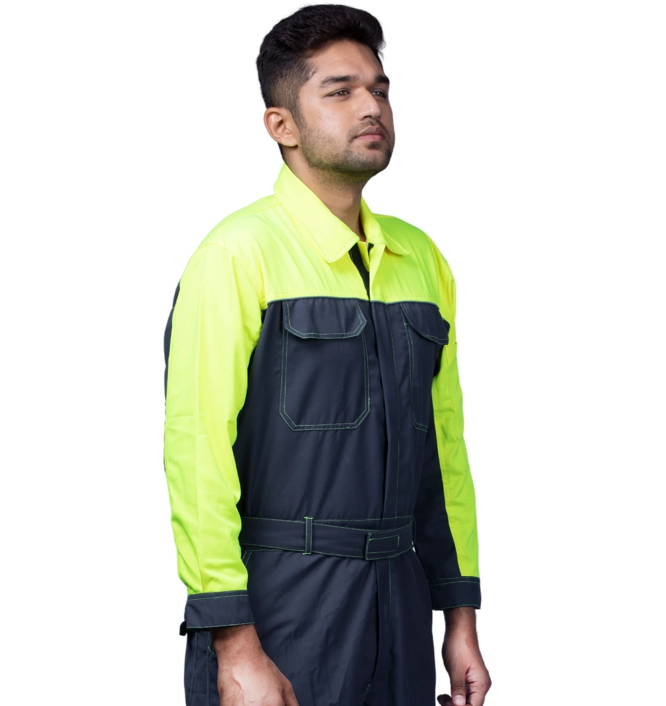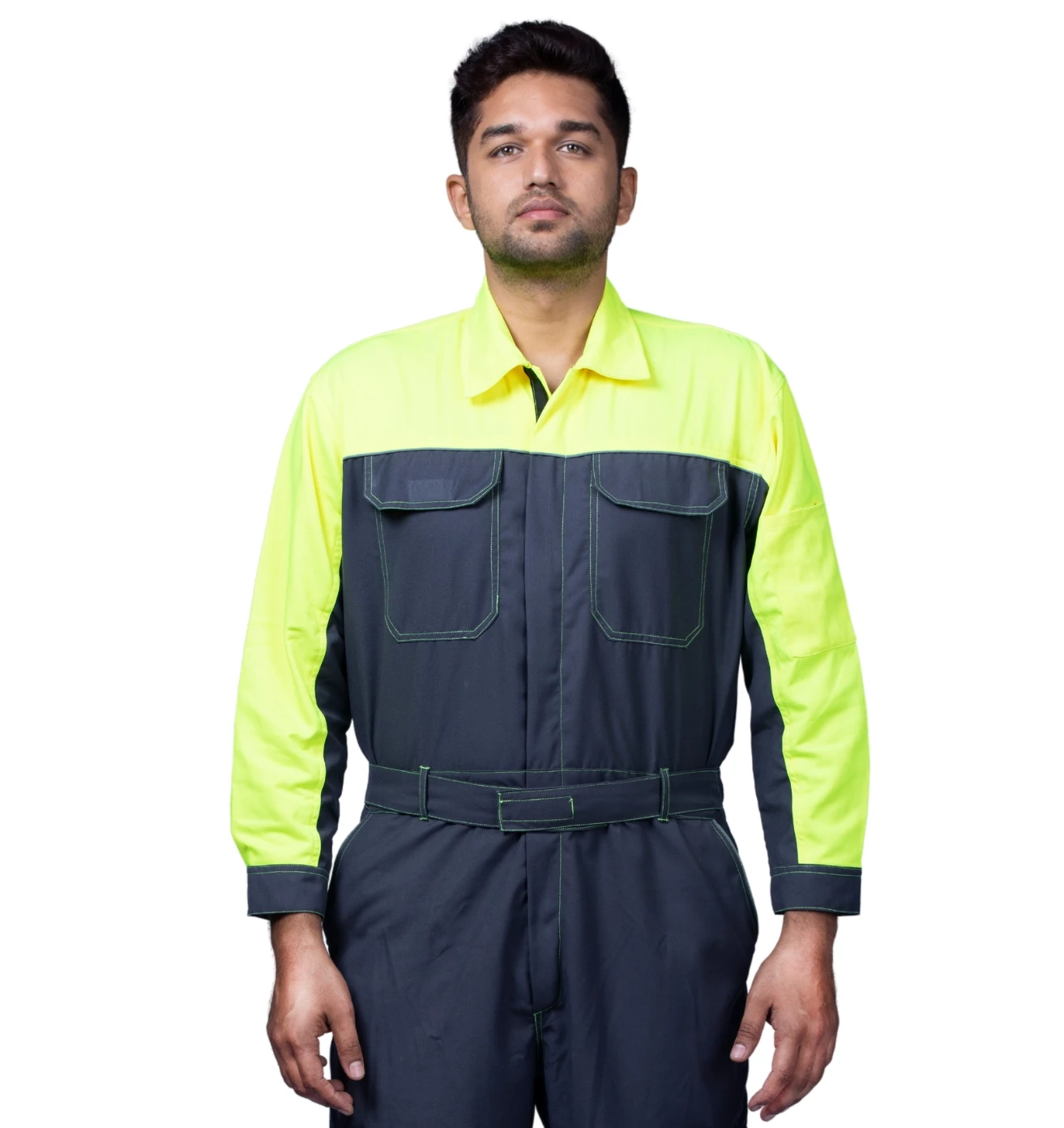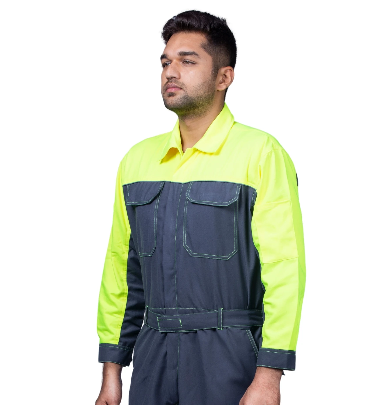 Sturdy grey and green boiler suit offering superior comfort, safety, and durability for demanding industrial tasks.