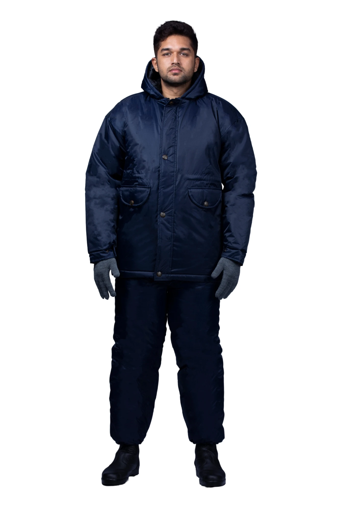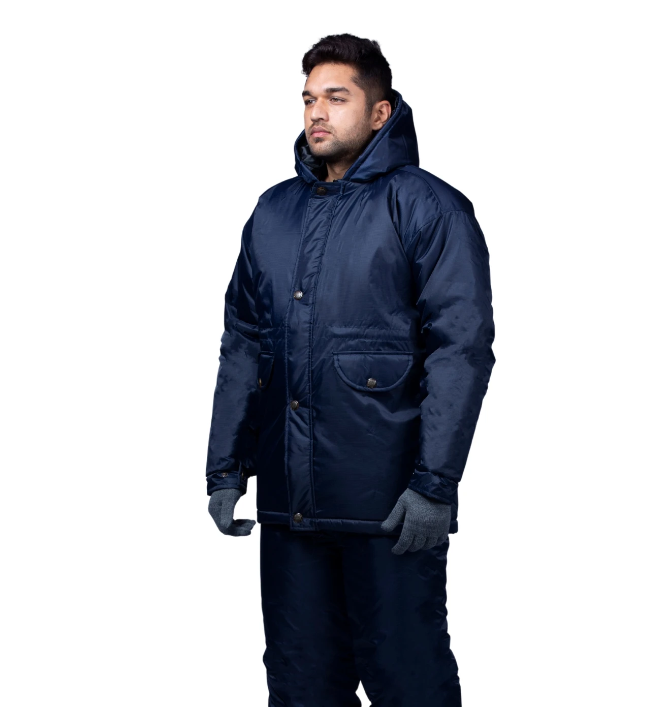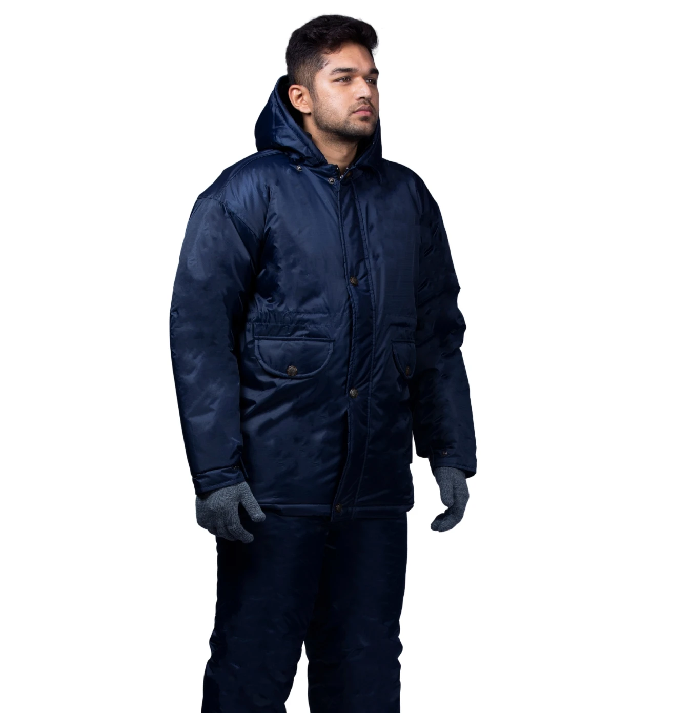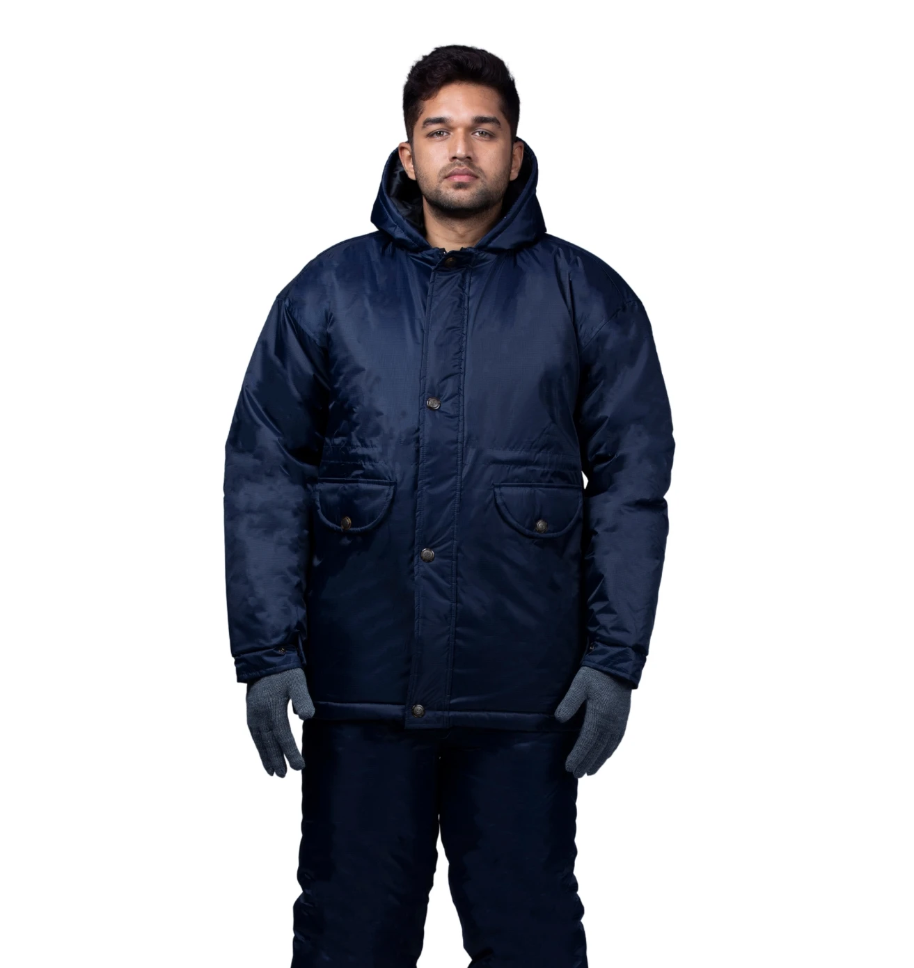 Insulated navy blue coldroom suit designed for maximum warmth, flexibility, and protection in low-temperature work environments.
